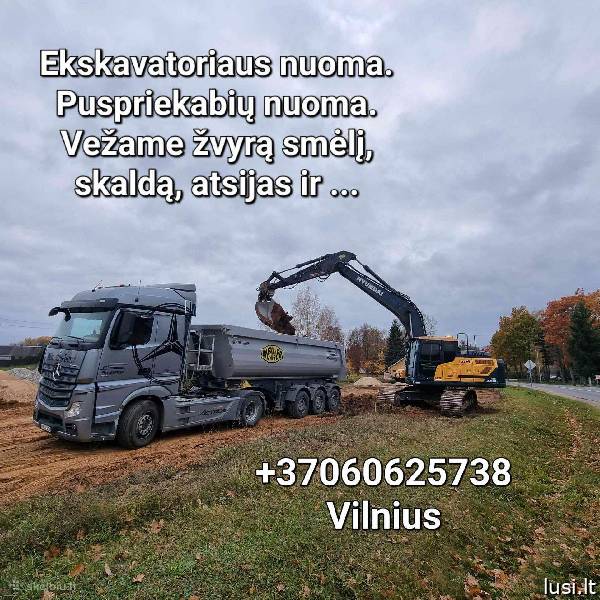 VEŽAME Juodžemį, augalinį sluoksnį, durpes, žvyrą (įvairių frakcijų), smėlį (įvairių frakcijų ir plautą), skalda, betoninę skaldą, akmens dulkes, trupintą betoną, frezuotą asfaltą ir kitas.