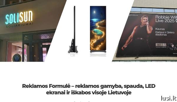 Ieškote patikimo partnerio reklamos gamyboje? Reklamos Formulė siūlo visapusį reklamos sprendimų spektrą nuo reklaminių tentų, lipdukų, vizitinių kortelių iki LED ekranų, tūrinių raidžių, šviesdėžių ir lauko reklamų. Gaminame, spausdiname ir montuojame tiek vidaus, tiek išorės reklamos priemones, naudodami pažangiausias UV, plačiaformatės ir skaitmeninės spaudos technologijas.